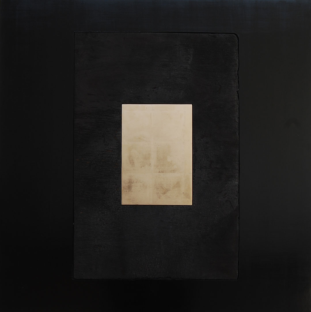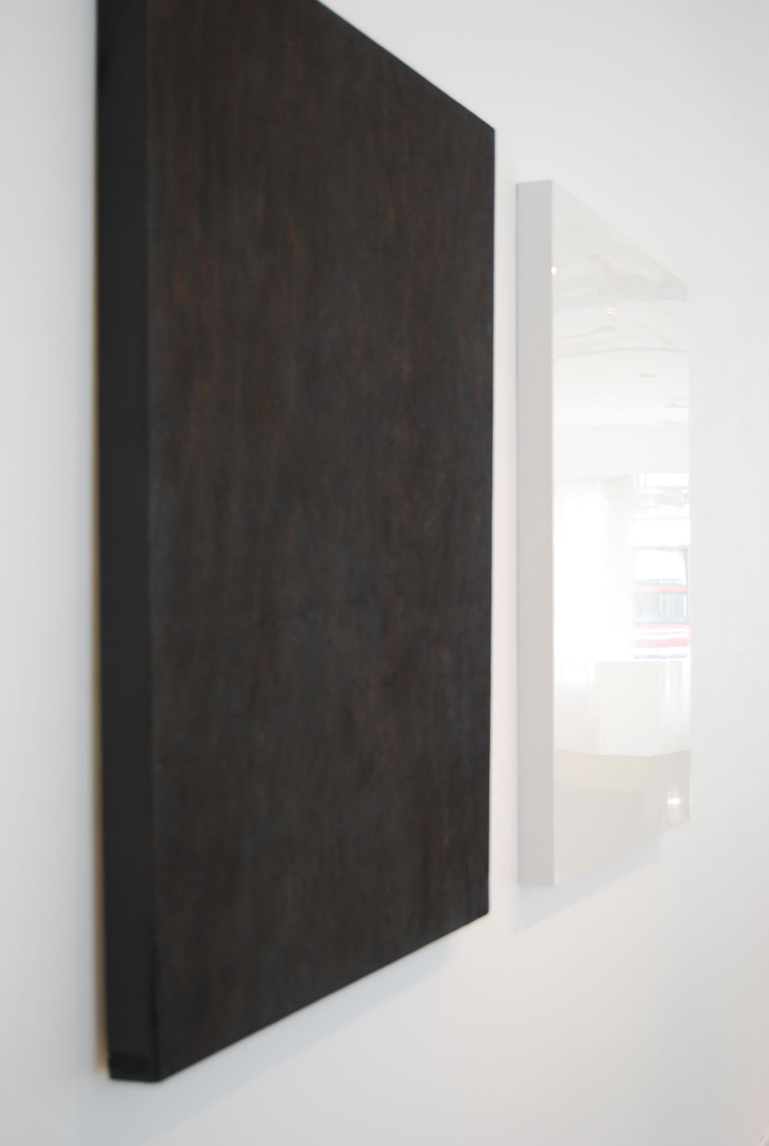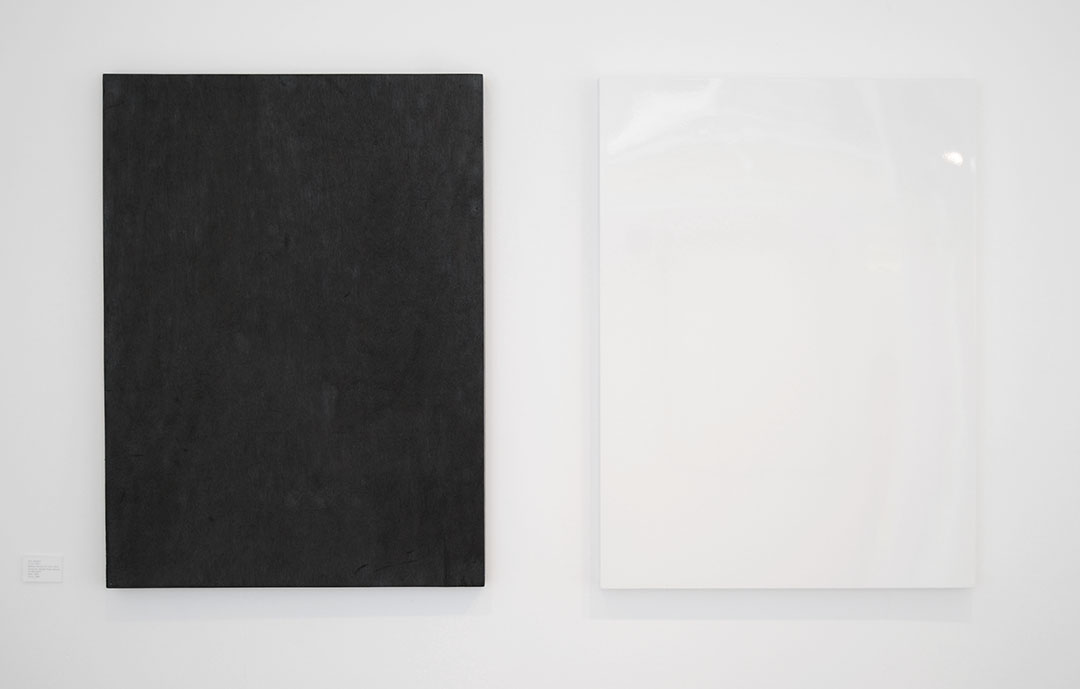 "Ghost" 2001 2 x wooden panels 33"x 66" one with gesso and appliance white spray, the other burnt black