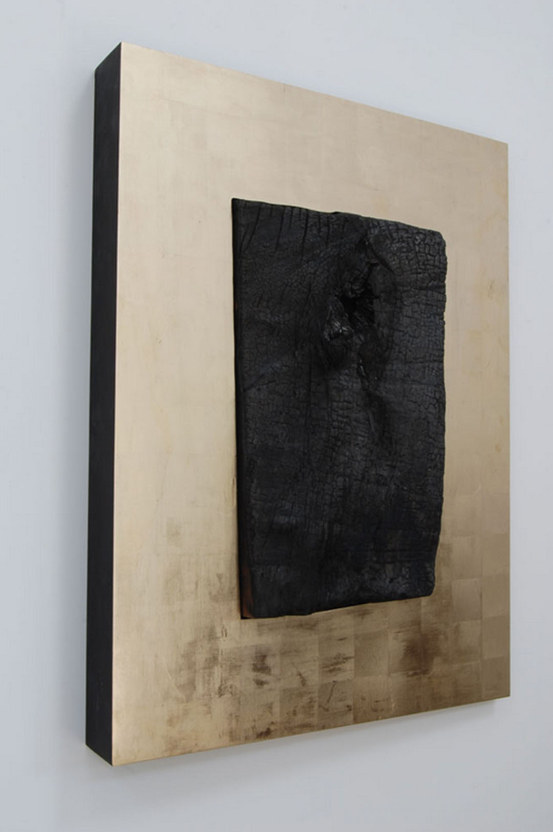 "Raw Roar" 2010 Burnt spalted ash block of wood, 21ct gold leaf and gessoed wedge shaped timber structure 33" x 44" x 7" (max depth of wedge)