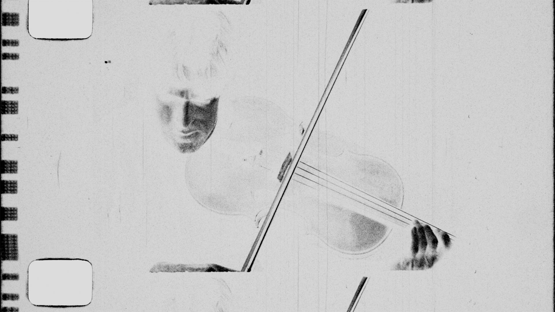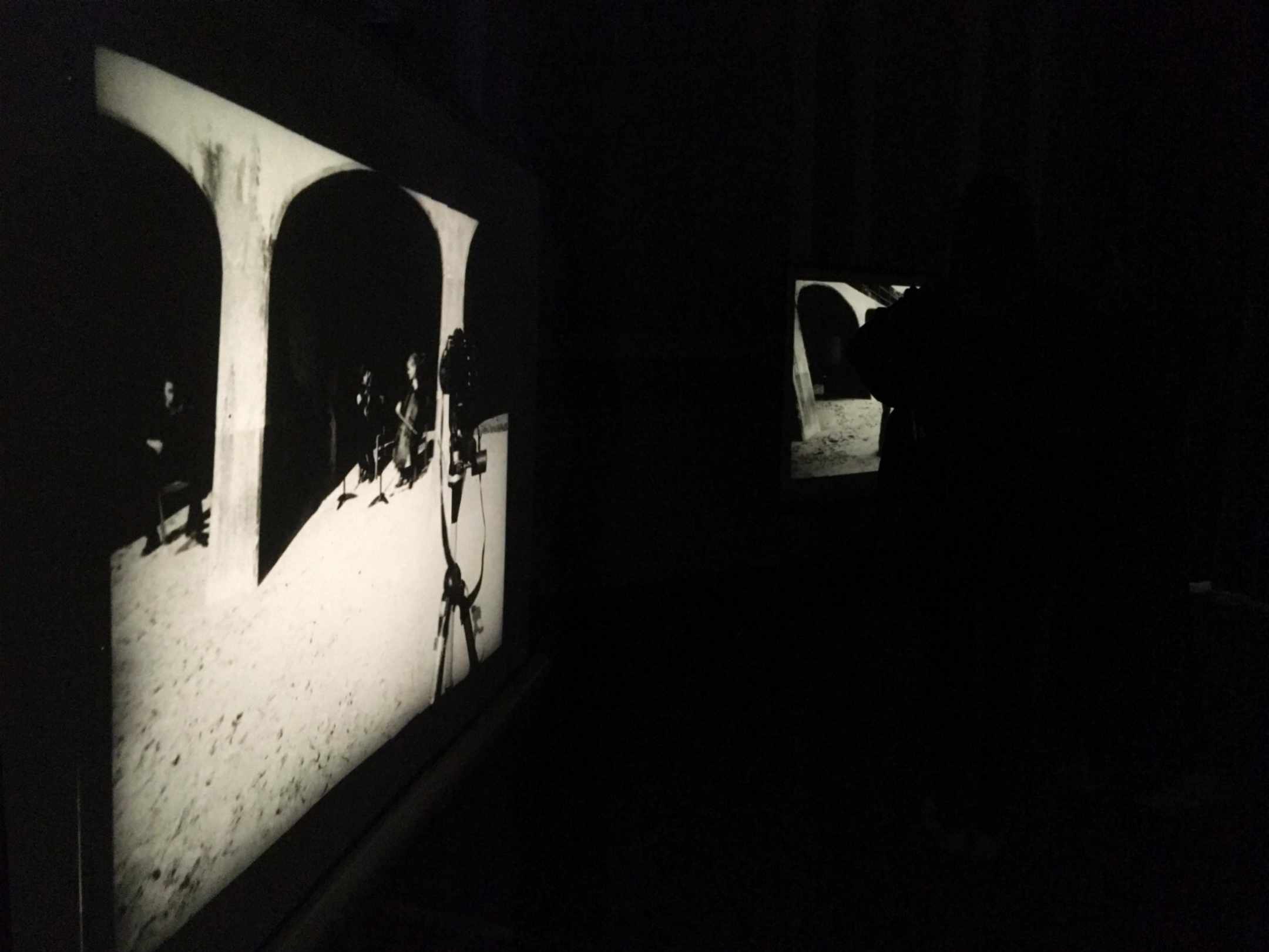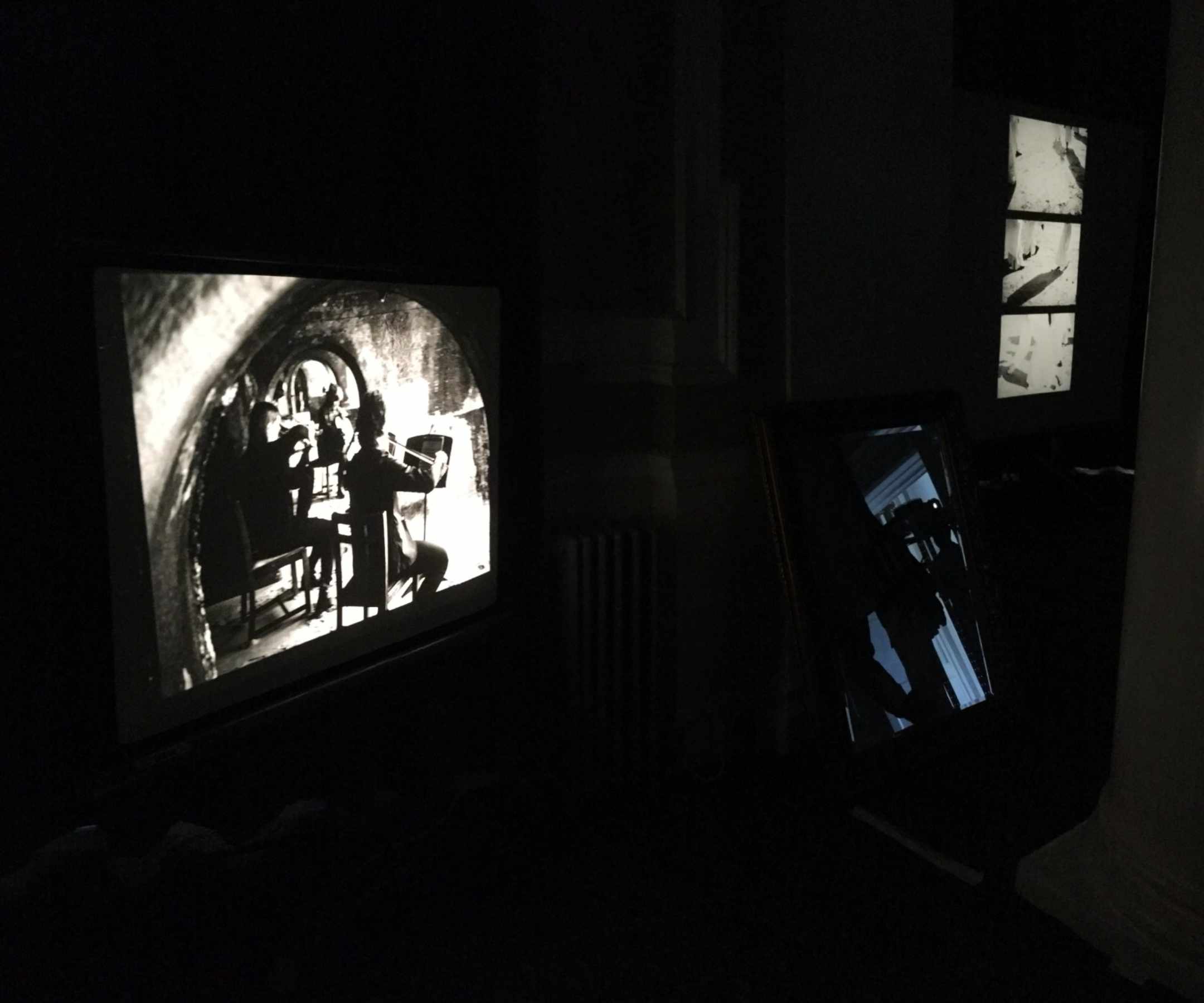 Matt Rowe's Sacconi Quartet portrait "Quartet" seen on the left, the 16mm film "Tempo Adagio" projection on the right, at ‘Beethoven on the Beach Revisited’, a light & sound Installation curated at The Grand, Folkestone, May 2022. Digital photo by Henry Uniacke.