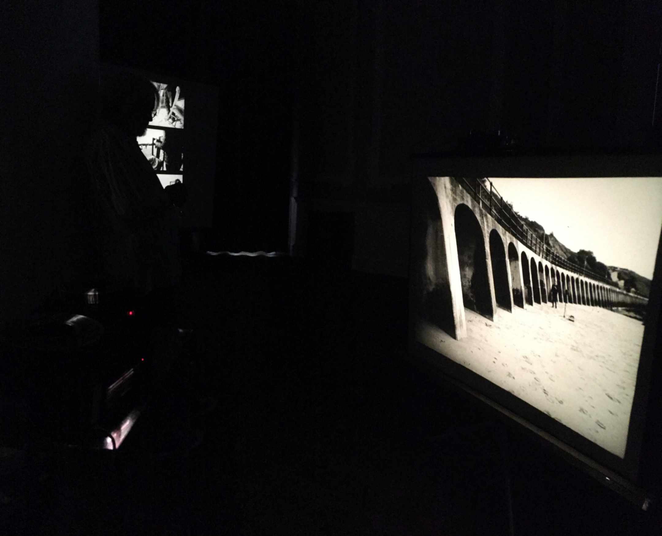 One of the screens in Mick Williamson's projector installation at ‘Beethoven on the Beach Revisited’, a light & sound Installation curated at The Grand, Folkestone, May 2022. Digital photo by Henry Uniacke.